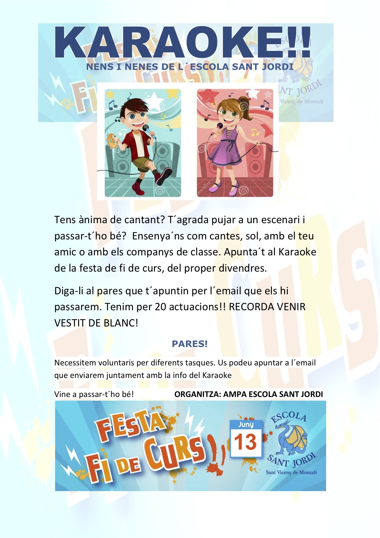 Us enviem dos enllaços per apuntar als vostres fills al Karaoke de la festa i per donar un cop de mà en certes franges horàries.