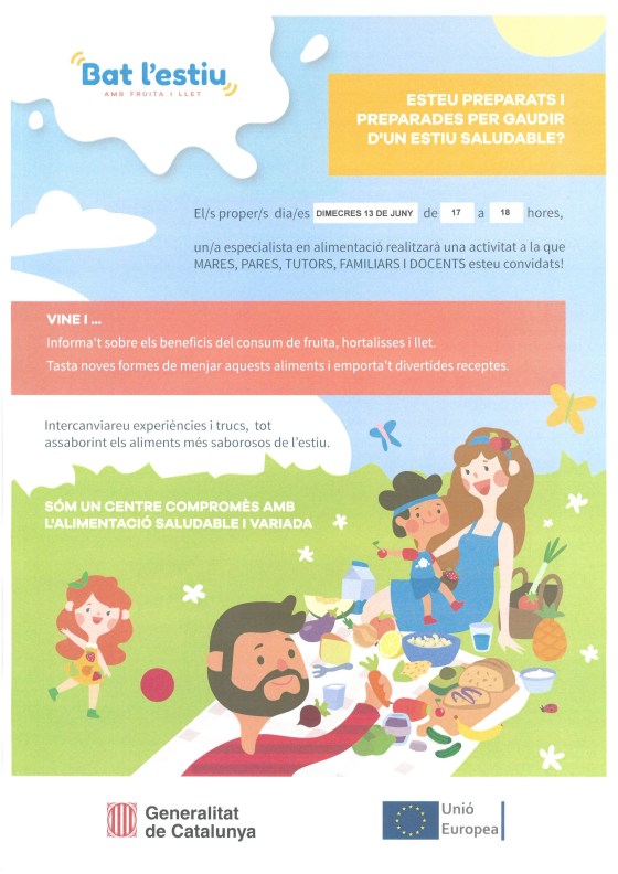 per facilitar la vostra assistència a la xerrada del proper 13 de juny sobre alimentació saludable, l’AMPA posa a disposició de les famílies el servei de monitoratge gratuït.