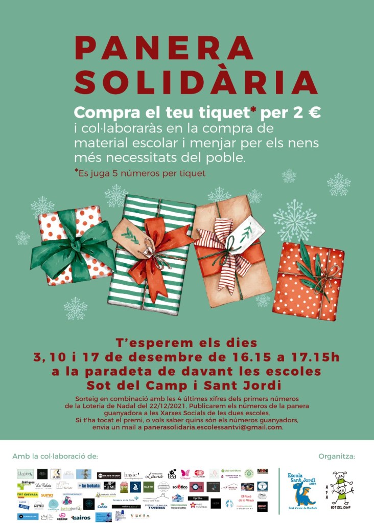 Aquest any hem fet també 3 super paneres solidàries, amb les aportacions de comerços i empreses del poble i rodalies, i famílies de les dues escoles. Aquestes paneres porten des de productes d’alimentació fins a vals per massatges, estètica, perruqueria, esmorzars, dinars,… tindran molta sort els que els hi toquin!!