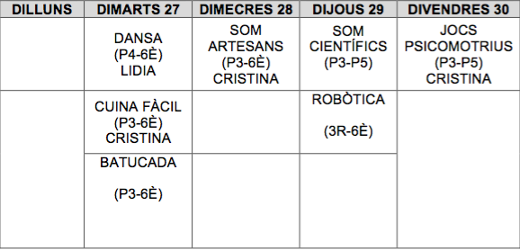 – Les noves activitats d’aquest any són: Batucada (de 1er a 6è), Cuina fàcil (P3, P4 i P5), Jocs Psicomotrius (P3, P4 i P5), Som artesans (de P3 a 6è), Som científics (P3, P4 i P5), Robòtica (de 3er a 6è) i Voleibol (de 4rt a 6è)